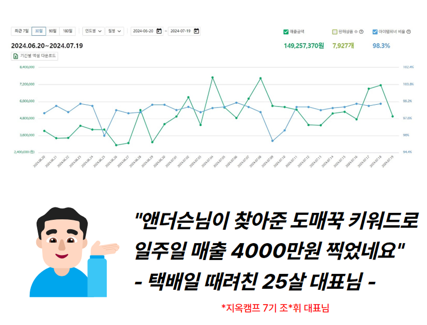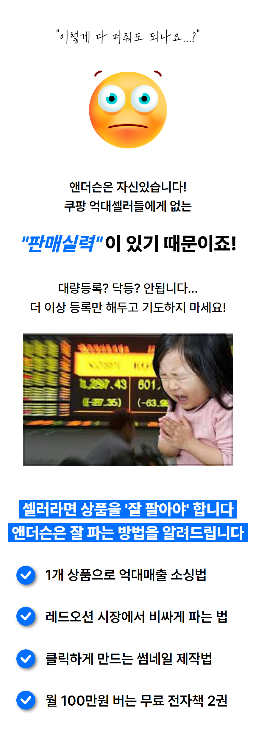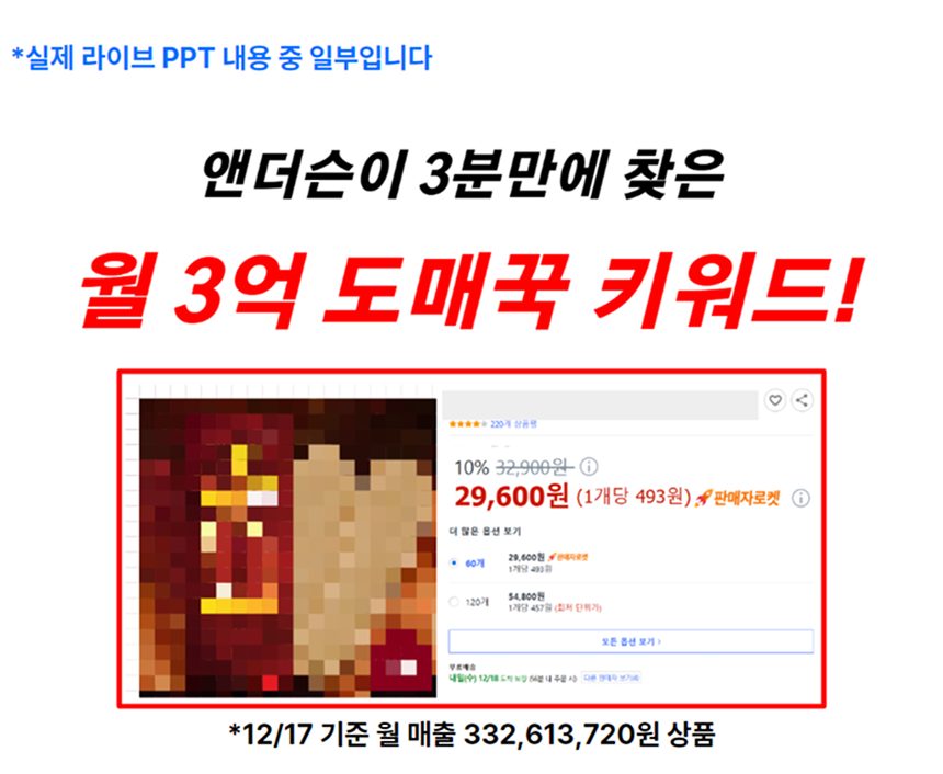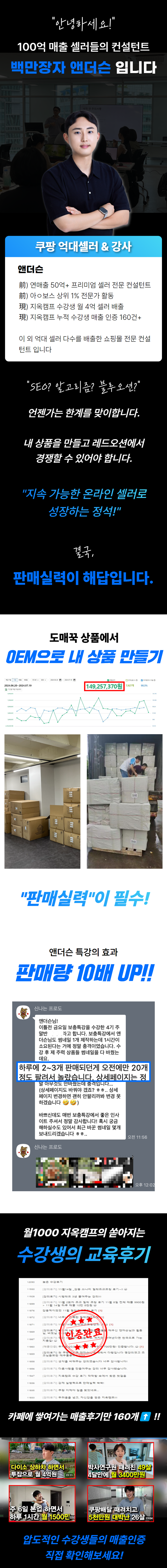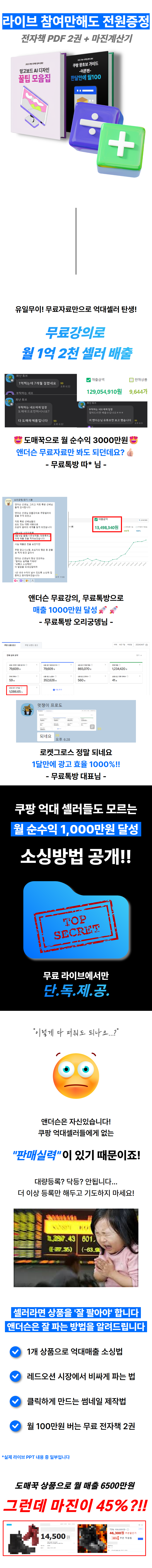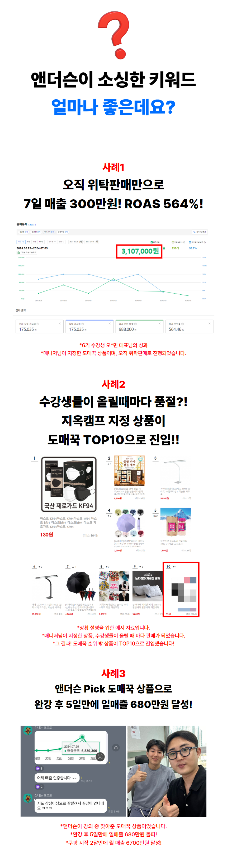 역시나 유익한 내용이었습니다!소싱팁 강의 부분이 특히 제게는 큰 의미가 있었습니다.그리고 두분의 수강생님들의 생생한 성공담과 질문에 대한 답변들이 많은 도움이 되었습니다.도매꾹으로도 충분히 큰 매출과 순수익을 낼 수 있다는 것을 입증시켜주신것 같습니다.판매전략을 가지고 상품등록을 해야한다는 점을 알게 되었고매일 매일 30분이상 판매실력 기본기 훈련을 해야한다는 것도 크게 공감이 갔습니다.유익하고 알찬 무료 라이브해주신 앤더슨님께 너무 너무 감사합니다!!!