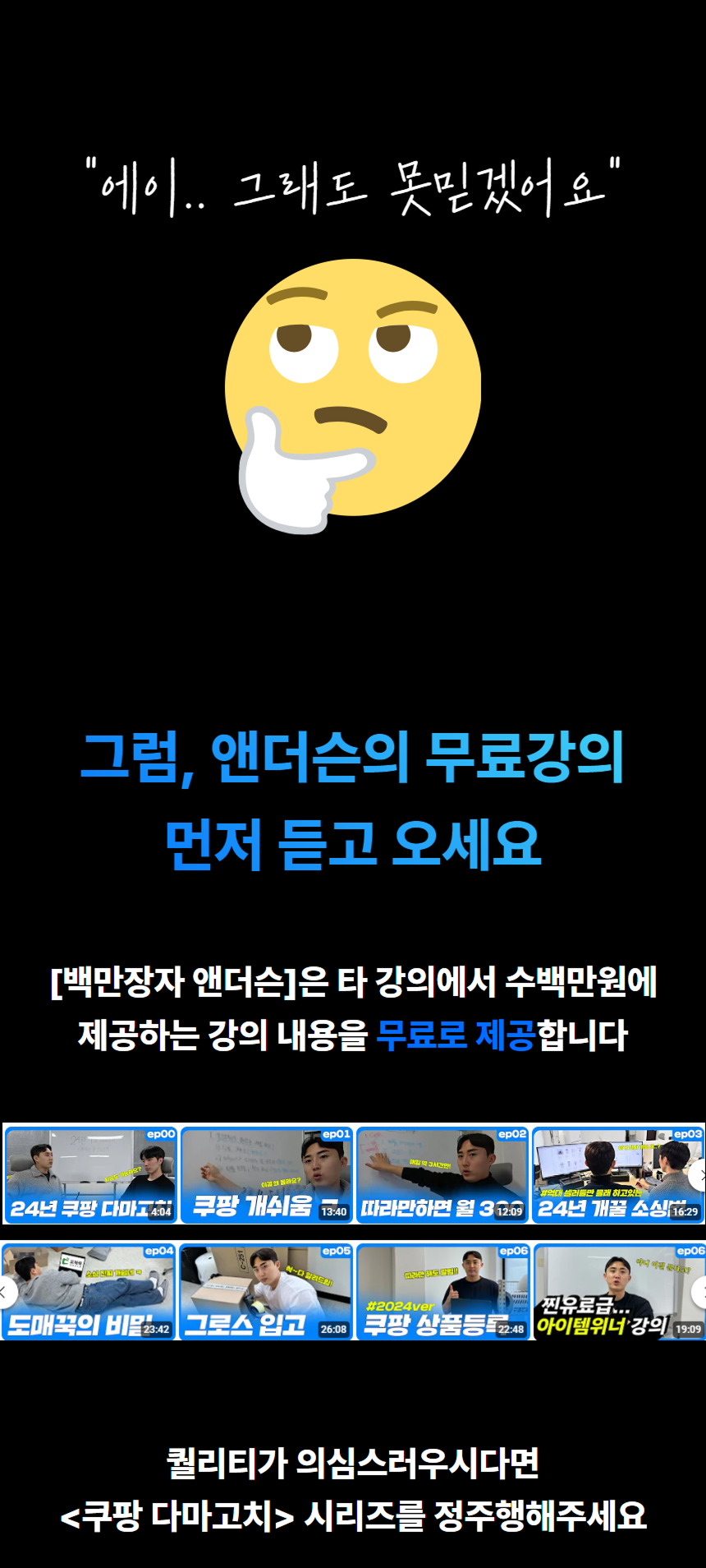 앤더슨님 강의 예고 영상을 보고 나니, 평범한 홍보가 아니라 마케팅 실전의 핵심을 콕 집어 설명해주는 맛이 제대로 났어요.하나하나의 표현이 워낙 생생하고 현실감 있어서, 사업하는 나로선 \'이건 당장 써봐야 해!\' 싶은 인사이트가 넘쳤습니다. 지금까지 광고 예산만 무작정 투입하던 패턴을 반성하게 되더라고요.앤더슨님의 말투가 부드럽고 설득력 있어서 한순간도 놓치지 않고 집중됐어요. 단순 매출 증대가 아닌, 브랜드의 체계적인 성장 전략을 제대로 이해한 기분이 들었어요. 다음엔 정규 강의도 신청해서 직접 느껴보고 싶네요